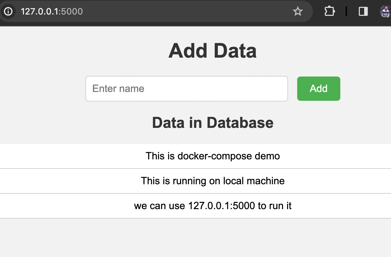 Since we are running this application on the local machine, we can use localhost(127.0.0.1) to access the application on port 5000. If you are running this on an EC2 machine with a public IP, use that IP to access the application.