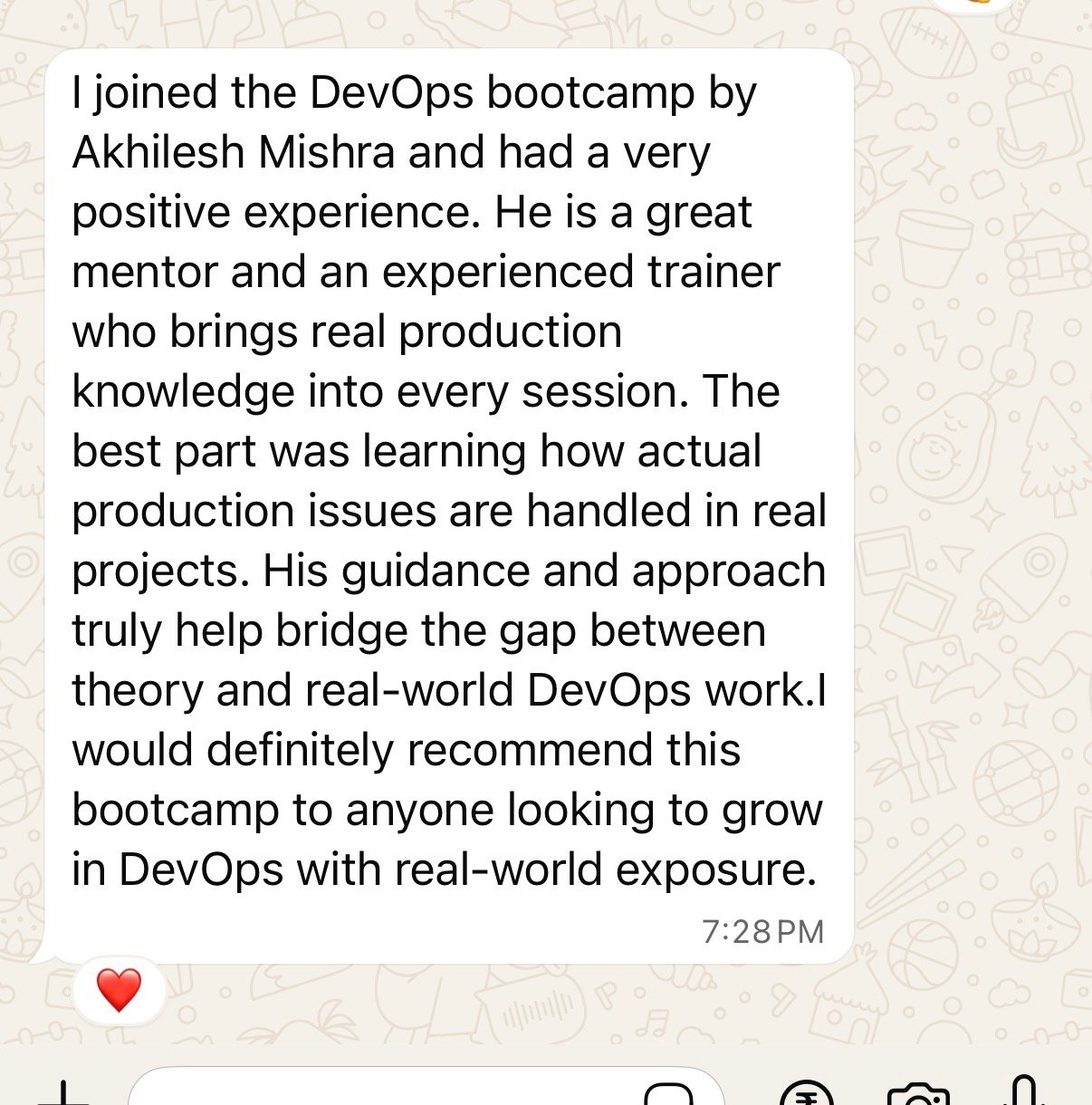 Akhilesh's DevOps Boot Camp delivered a genuine real-world experience that other platforms lack. It strengthened my practical skills and made me job-ready for real DevOps environments. This bootcamp really helped me understand the real world production environments, specially the live troubleshooting part. I was able to crack the interview and move to Devops from cloud support role.