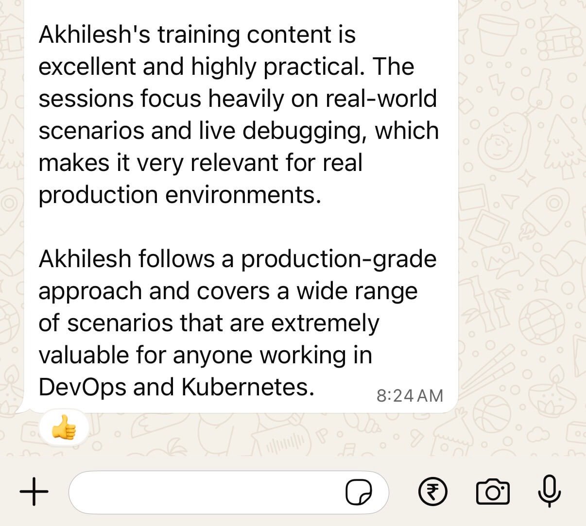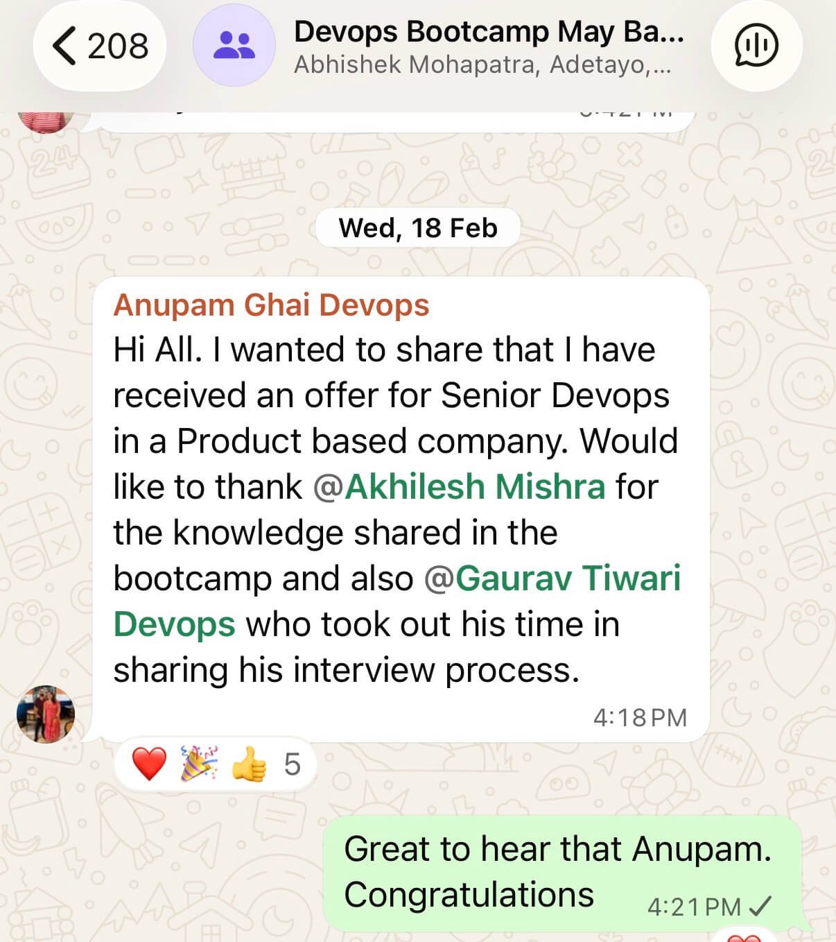 Akhilesh's DevOps Boot Camp delivered a genuine real-world experience that other platforms lack. It strengthened my practical skills and made me job-ready for real DevOps environments. This bootcamp really helped me understand the real world production environments, specially the live troubleshooting part. I was able to crack the interview and move to Devops from cloud support role.