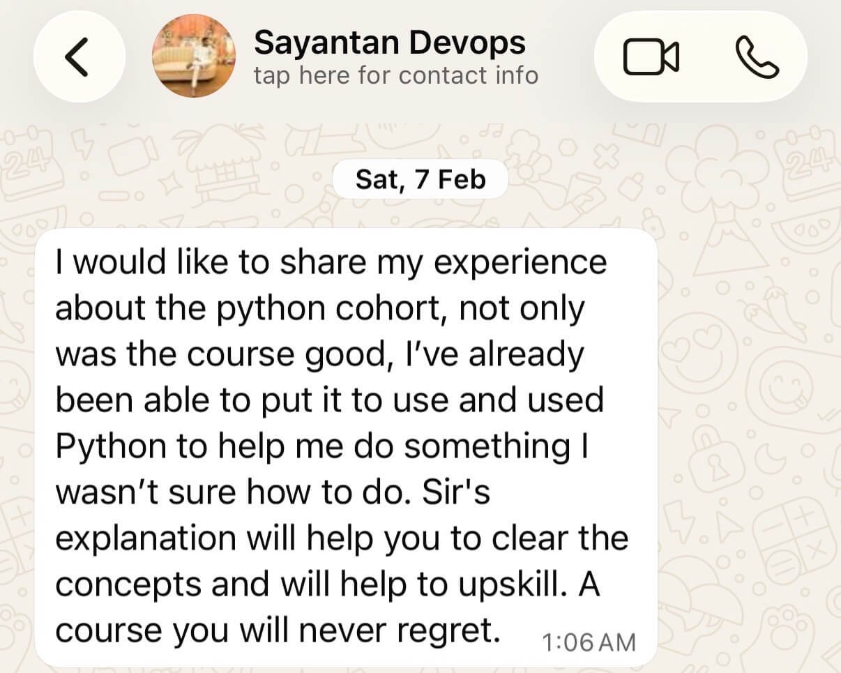 I gained valuable hands-on experience and built confidence working with various DevOps tools, real-world projects, and practical implementations. He has been amazing always supportive, and continues to guide me even now. His guidance and deep technical knowledge have made a huge difference in my learning journey. couldn’t have asked for a better mentor.