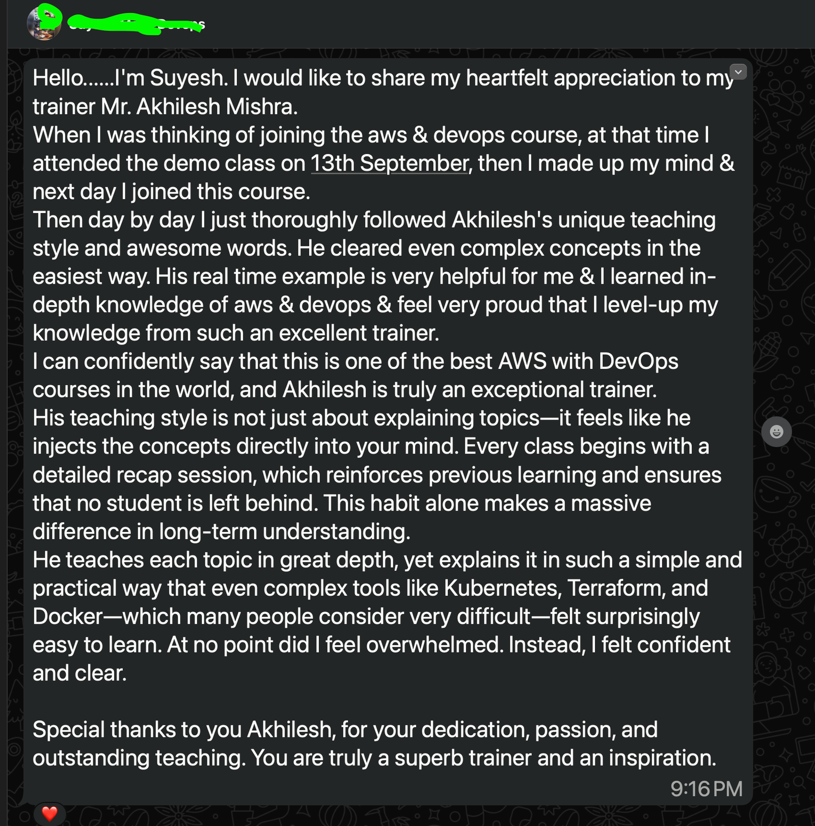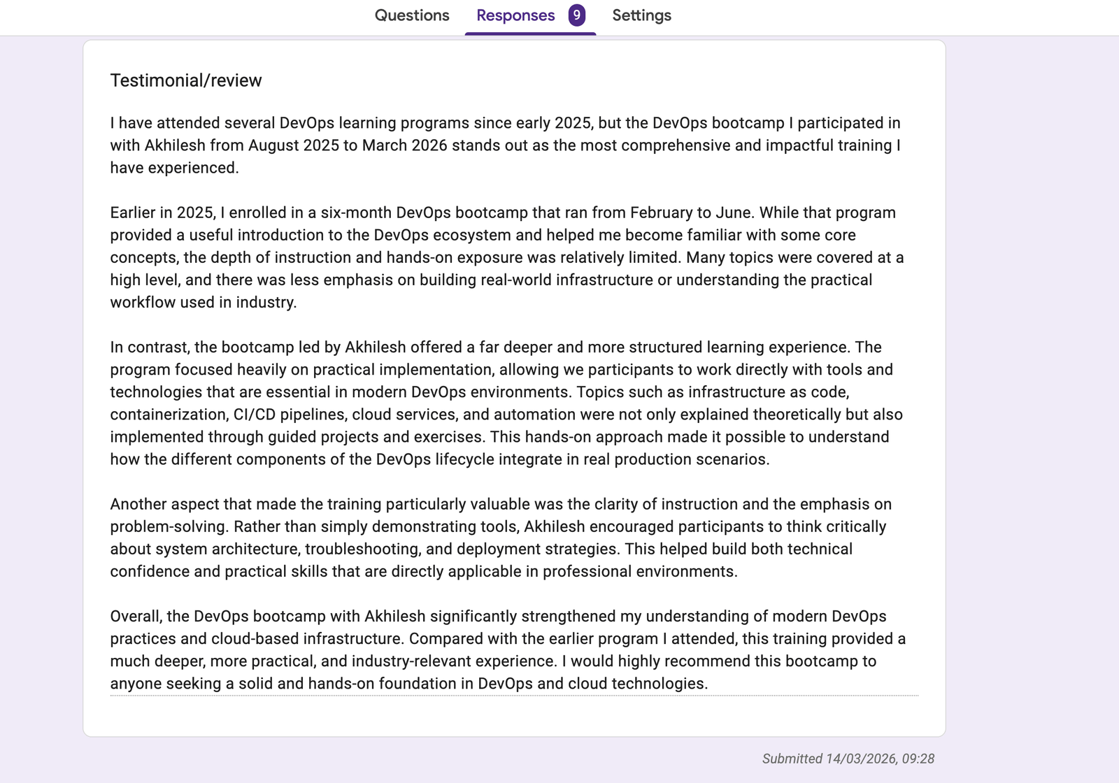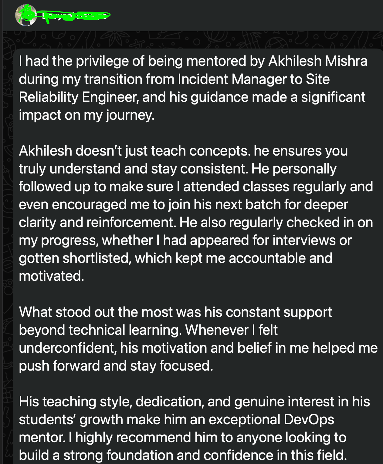 "I recently completed the DevOps bootcamp from Akhilesh, and it was a game-changer. His ability to break down complex concepts into actionable steps made the material incredibly easy to digest. I walked away not just with new knowledge, but with the confidence to apply it immediately to my role."